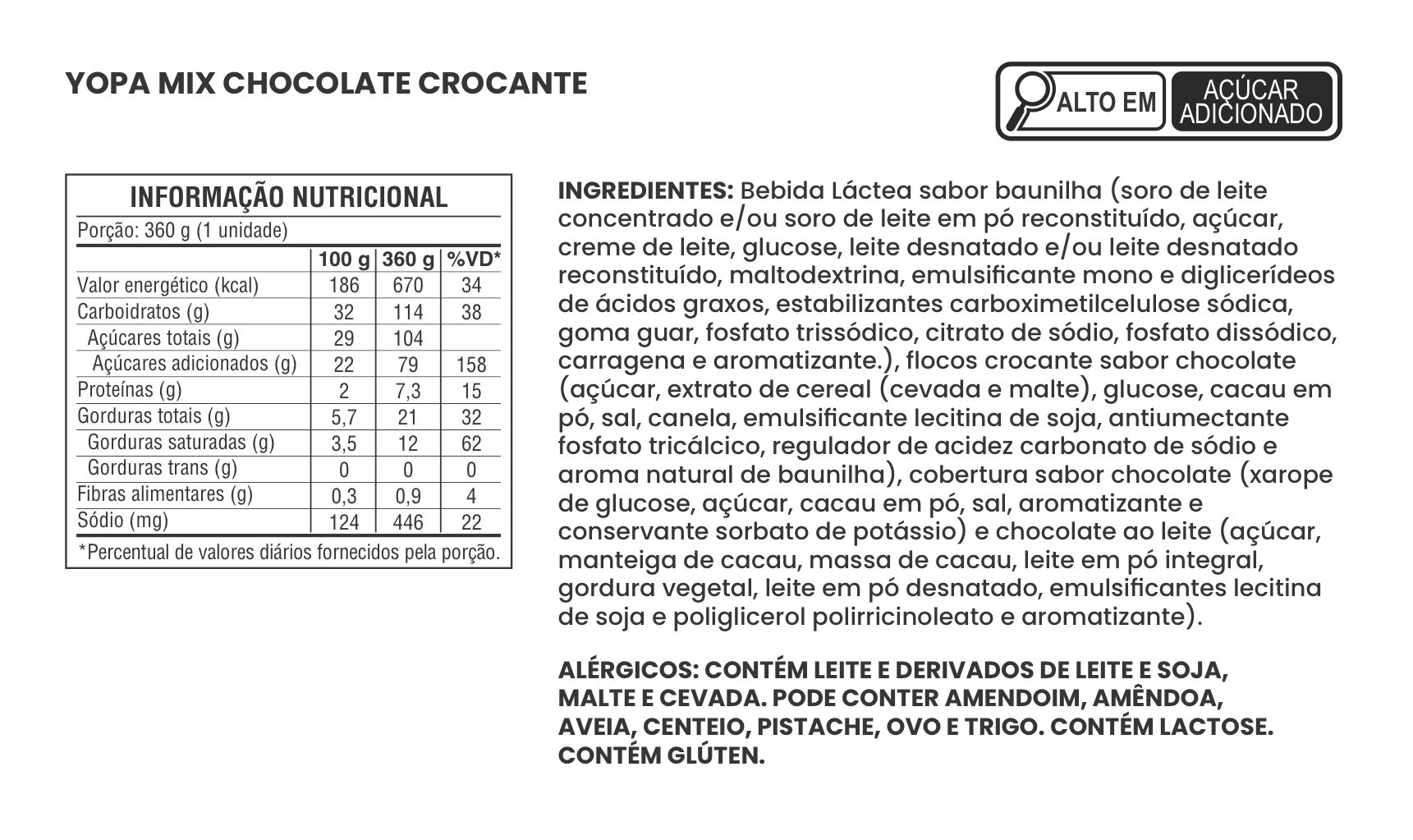 Sorvete de baunilha, cobertura de chocolate c/ flocos crocantes de chocolate e tablete de chocolate ao leite.